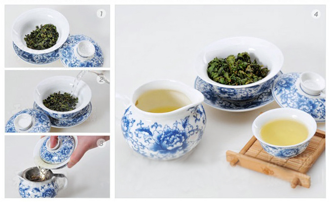 - เติมน้ำร้อนลงในถ้วยชงชา แล้วเทน้ำออกทันที เพื่อเป็นการทำความสะอาดและอุ่นใบชาให้ตื่นตัว แล้วเติมน้ำร้อนจนเต็ม ปิดฝาทิ้งไว้ประมาณ 30-60 วินาที โดยประมาณ (ตามความชอบส่วนตัว ยิ่งนานยิ่งเข้ม(ขม) แต่ไม่ควรนานเกิน 3-5 นาที)